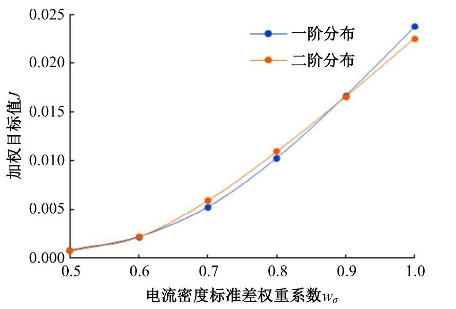 为提高燃料电池膜电极各处电流密度的大小及分布均匀性,采用多项式函数近似模拟催化剂载量的分布规律,并构建燃料电池平均电流密度和电流密度均匀性的加权目标函数。通过数值仿真求解多项式系数与加权目标函数的映射关系,进而优化分布函数。结果表明,与催化剂载量均匀分布的燃料电池相比,采用优化的非均匀催化剂载量分布的燃料电池虽然平均电流密度略有下降,但电流密度均匀性提升显著。综合考虑电流密度和均匀性,非均匀分布优于均匀分布,且一阶非均匀分布函数优势更加明显。