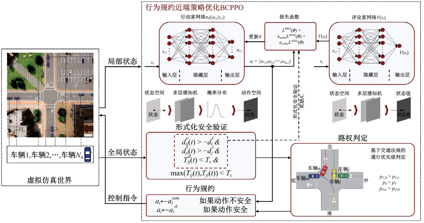 针对当前集中式协同控制方法存在计算效率低和无安全保障的问题,本文首先提出了一种基于强化学习的群体协同算法,将单智能体近端策略优化扩展到多智能体协同合作的复杂交互环境中,以解决多智能体系统的复杂合作问题。其次,将无信号交叉口车辆集中式协同控制形式化为多智能体强化学习问题,并提出一种安全增强的交叉口集中式协同控制方法——行为规约近端策略优化。该方法将形式化安全验证及行为规约融入群体协同算法,以指导策略安全迭代优化和避免非安全驾驶行为,进一步保障未知场景下的通行安全。最后,通过仿真软件Carla进行模拟实验。仿真结果表明:行为规约的纳入牺牲了8.06%的通行效率,获得了100%的安全提升;相较典型的模型预测控制方法,本文方法将计算时间缩短到1/326倍,交通效率提高了67.0%,碰撞率从63.5%降低到0,舒适性提升了26.5%。