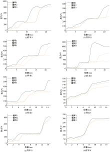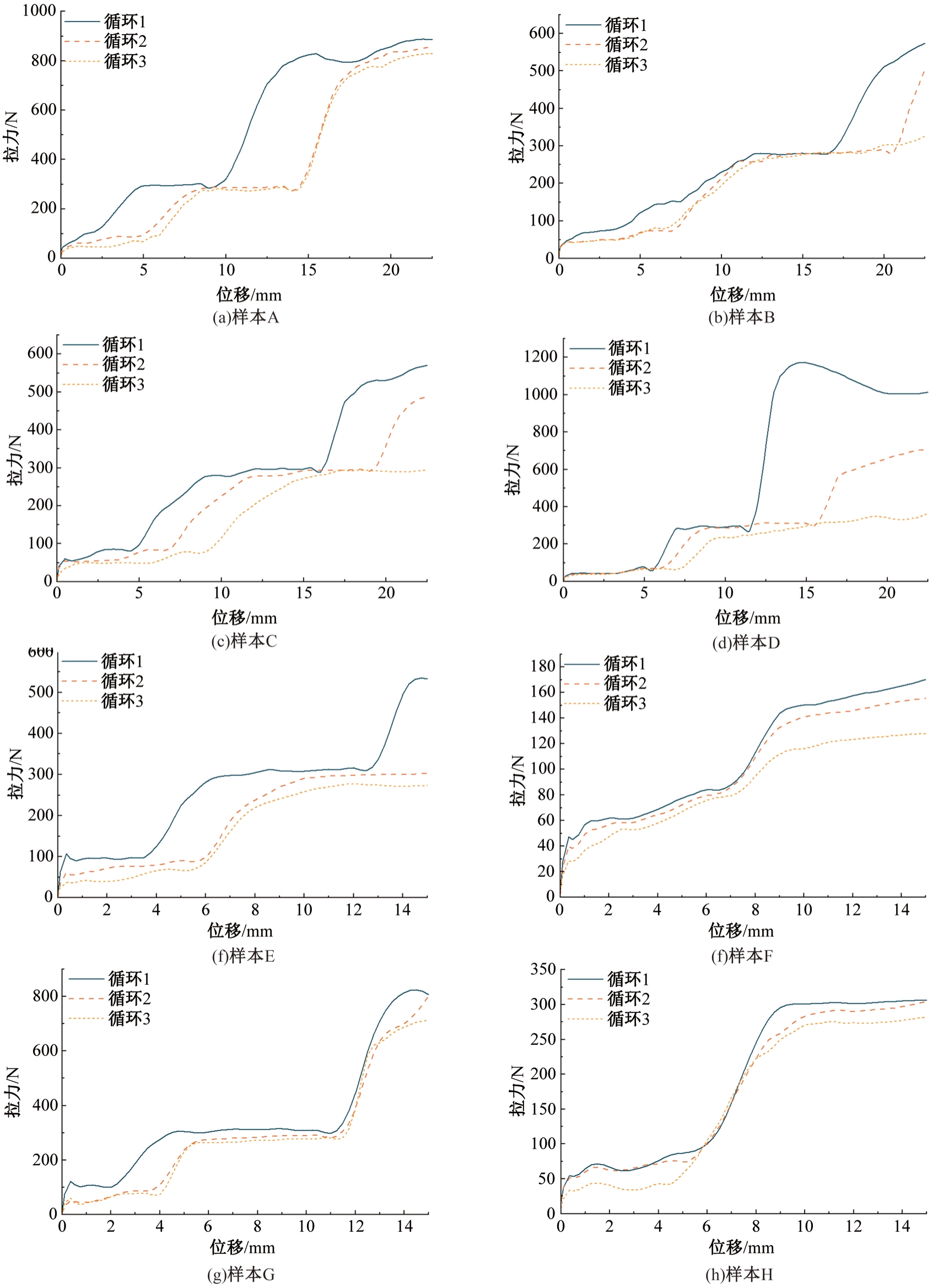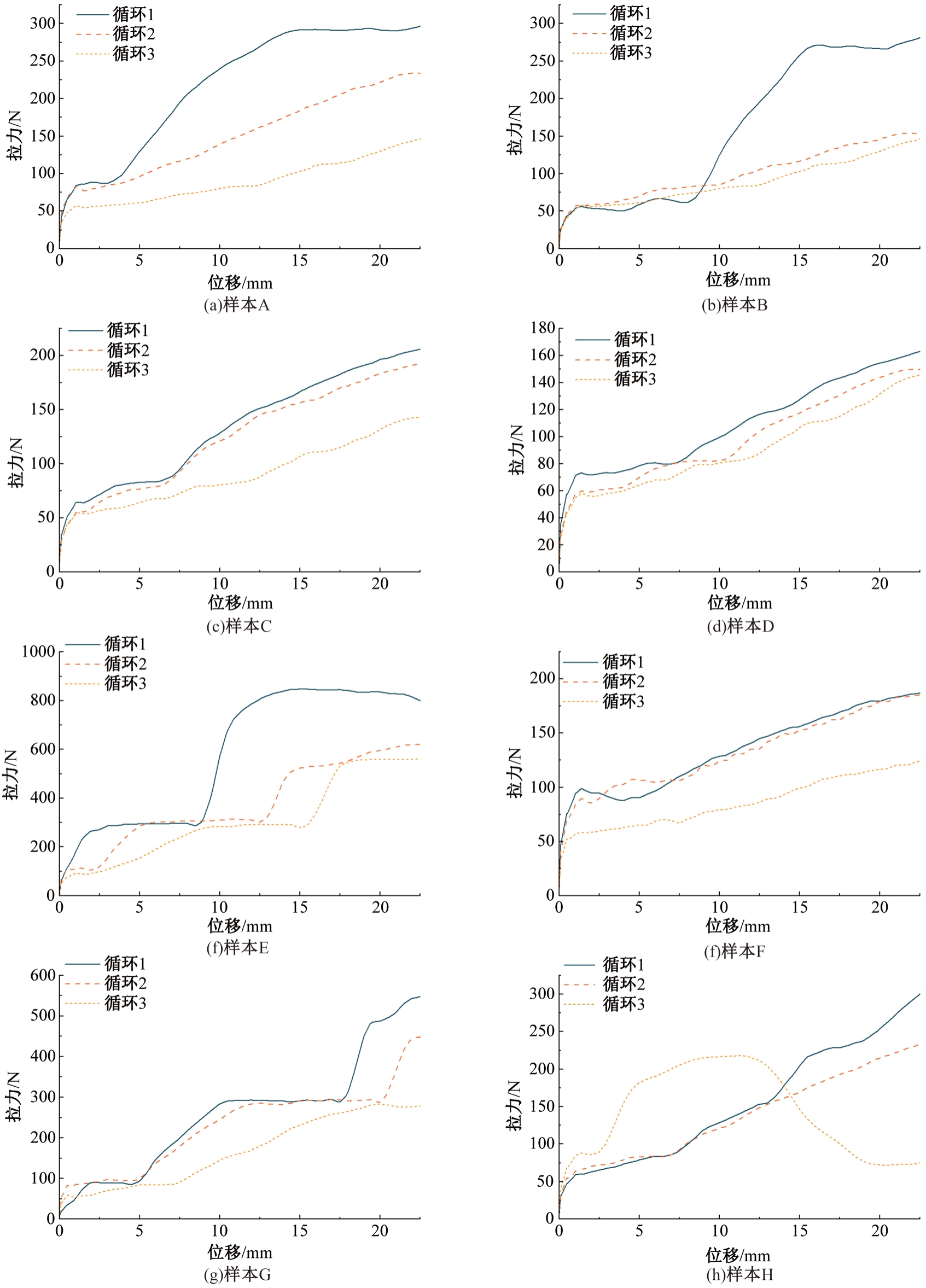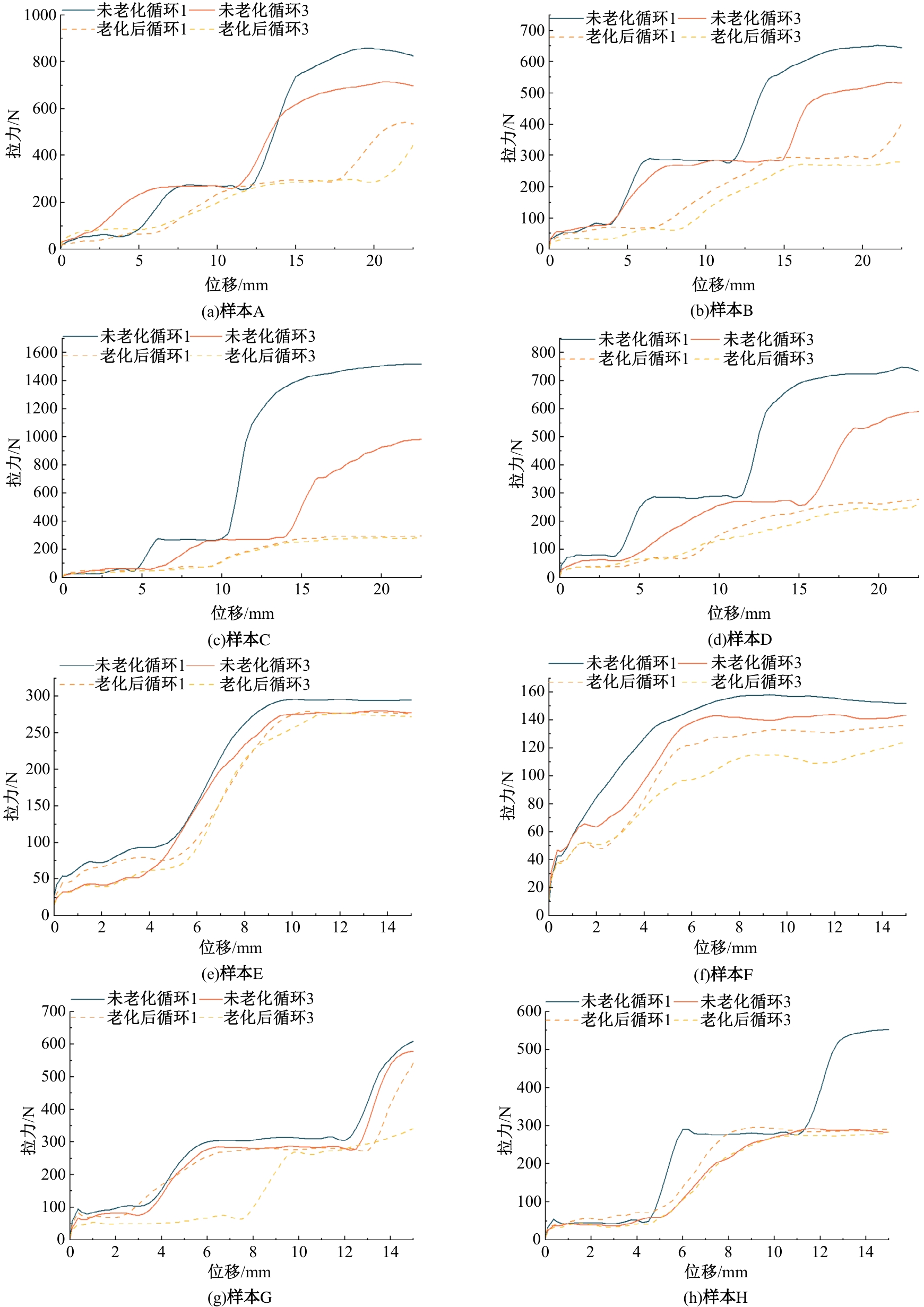 冻融循环作用下各灌缝胶拉力与位移的关系曲线"