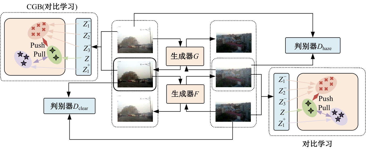 关键词: 图像去雾, 非成对图像, 生成对抗网络, 对比学习