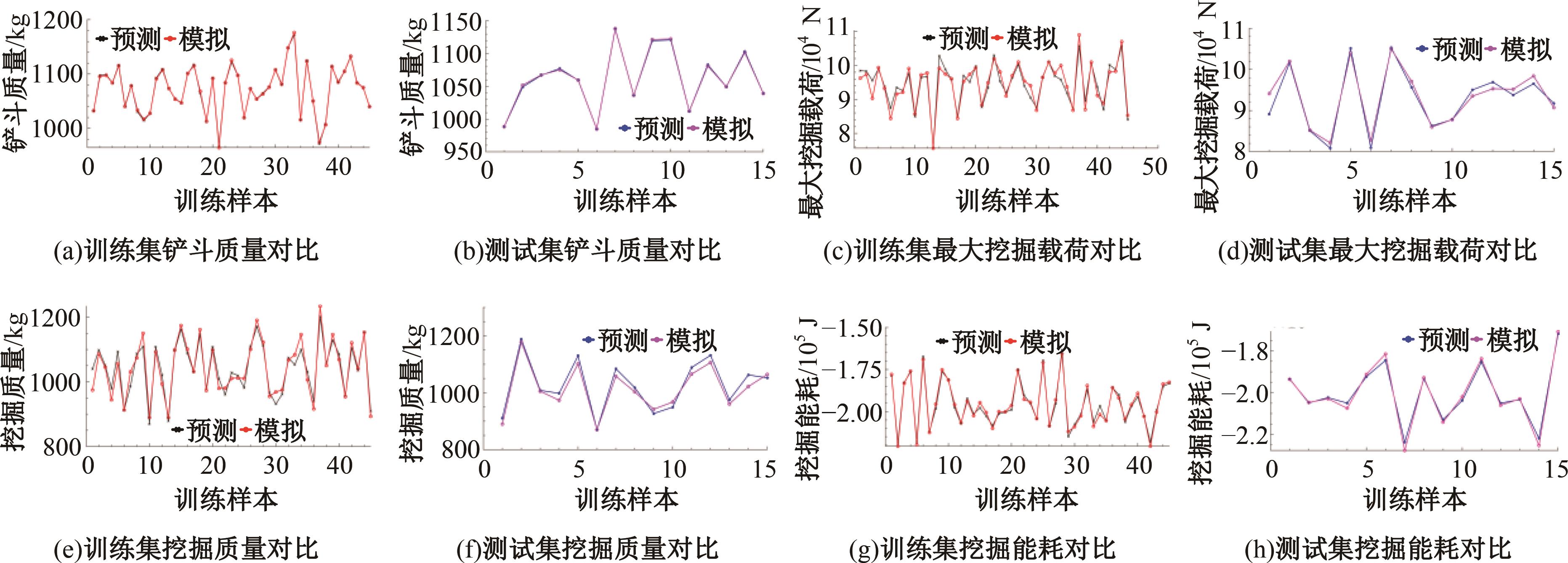 In order to optimize the design of excavator bucket structure and reduce the excavation energy consumption, this paper builds a joint simulation and optimization platform based on SOLIDWORKS, ADAMS, EDEM and MATLAB, and establishes a global optimization method for a medium-sized backhoe hydraulic excavator, which takes the maximal excavation load and strength of the bucket as the constraints, and the quality of the bucket and the unit excavation energy consumption as the optimization objectives. Through combined simulation of multibody dynamics and particle dynamics, load characteristics of the excavator during operation under different working conditions were obtained. Pearson correlation coefficients show a very strong correlation between experimental and simulated loads on the key hinge points of the bucket rod and boom, confirming the feasibility of using combined simulation to replace actual excavation operations. Multilayer perceptron (MLP) is used as the surrogate model and the parameters and hyper-parameters of MLP are optimized using Adam, Hyperband algorithm. The coefficients of determination R2 of MLP for bucket mass, maximum excavation load, excavation mass and excavation energy consumption are 0.999, 0.943, 0.933, 0.984 for Case Ⅱ; the R2 of MLP are 0.999, 0.944, 0.918, 0.925 for Case Ⅳ. The optimized MLP is combined with the NSGA-Ⅱ algorithm to iteratively optimize the bucket structure. The results show that the optimized bucket achieves a mass reduction of 7.06 % and a unit excavation energy consumption reduction of 6.47 % under the premise of meeting the requirements of the maximum excavation load and strength.
