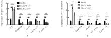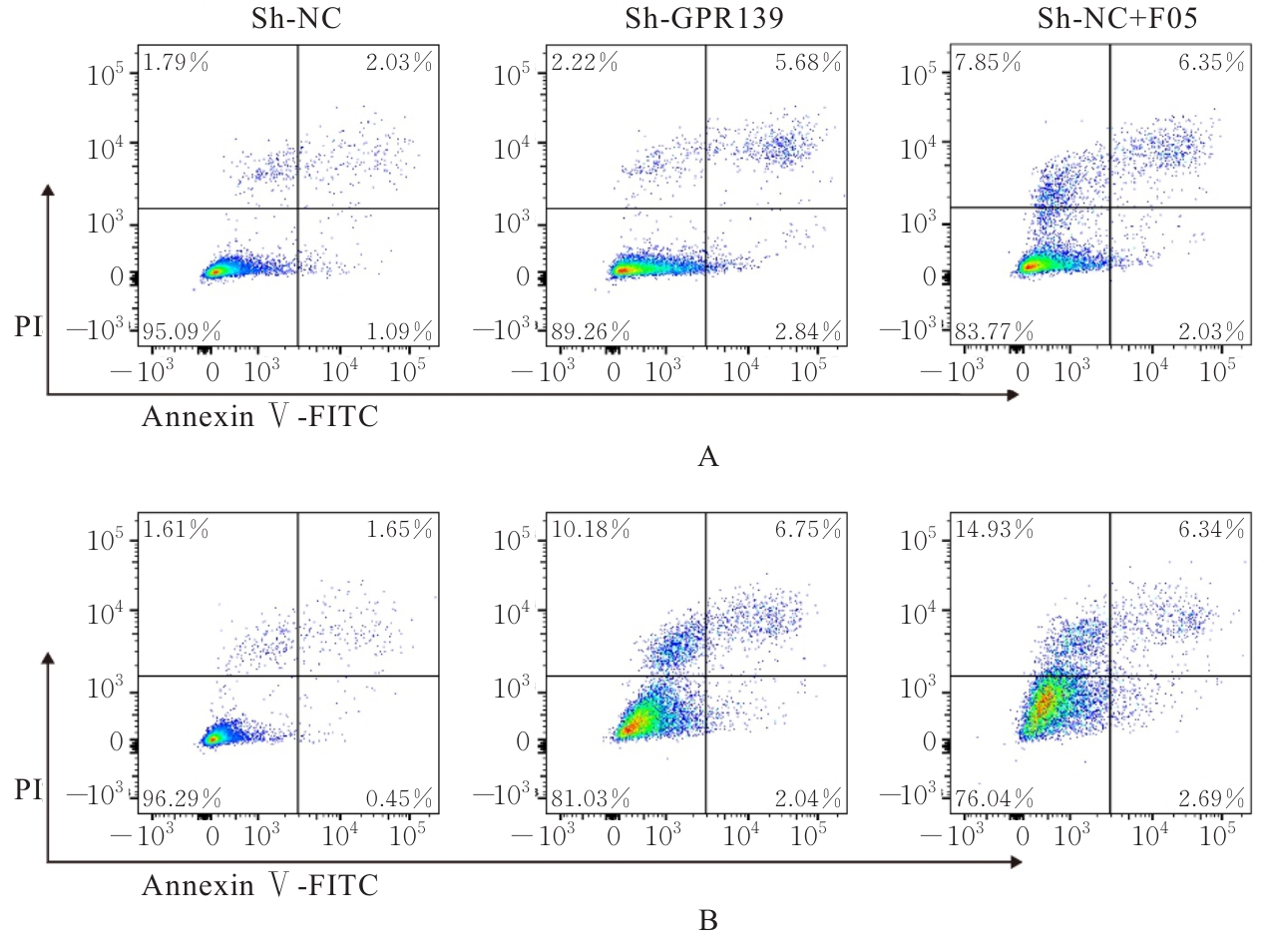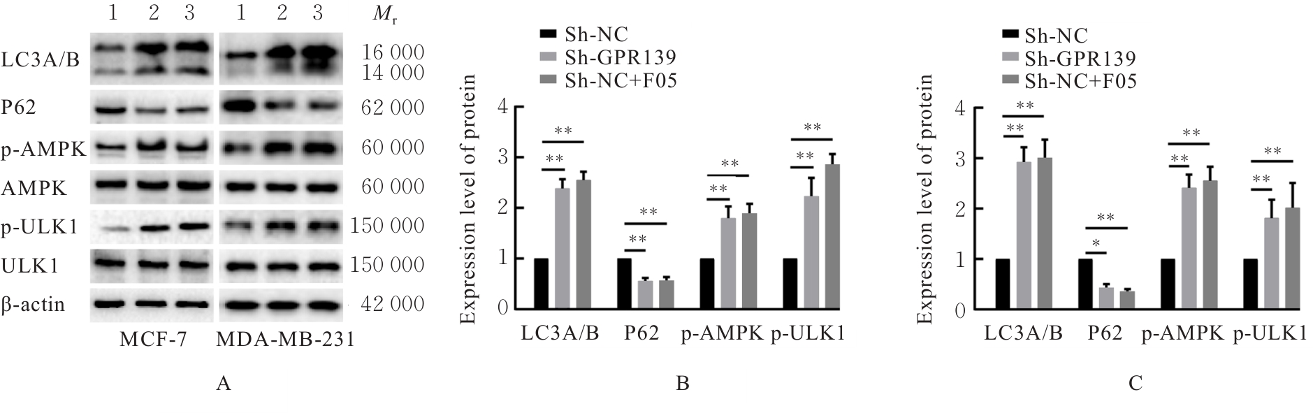 Objective To discuss the effect of silencing G protein-coupled receptor 139 (GPR139) gene on the proliferation, apoptosis and autophagy of breast cancer cells, and to clarify its possible mechanism. Methods The expression of GPR139 mRNA and protein in breast cancer tissue and normal tissue was downloaded from The Cancer Genome Atlas (TCGA) and Human Protein Atlas (HPA) databases; the GPR139 short hairpin RNA (shRNA) was transfected into the human breast cancer MCF-7 and MDA-MB-231 cell lines by lentiviral interference technology, and the cells were divided into sh-NC group (infected with negative control lentivirus), sh-GPR139 group (infected with GPR139 shRNA interference lentivirus), and sh-NC+F05 group (after infected with negative control lentivirus, GPR139 antagonist NCRW0005-F05 was added); methylthiazolyldiphenyl-tetrazolium bromide(MTT) method was used to detect the proliferation activities of the cells in various groups; Western blotting and real-time fluorescence quantitative PCR (RT-qPCR) methods were used to detect the expression levels of proliferation markers Ki-67Cyclin D1Cyclin E1, and P21 mRNA and proteins in the cells in various groups; flow cytometry was used to detect the apoptotic rates of the breast cancer cells in various groups; Western blotting method was used to detect the expression levels of adenosine monophosphate-activated protein kinase (AMPK), phosphorylated AMPK, Unc-51 like autophagy activating kinase 1 (ULK1), phosphorylated ULK1, microtubule-associated protein 1 light chain 3A/B (LC3A/B), and P62 proteins in the cells in various groups; immunofluorescence method was used to detected the expression level of LC3A/B protein in the breast cancer cells in various groups. Results The TCGA and HPA database results showed that the expression level of GPR139 mRNA in human breast cancer tissue was significantly higher than that in normal tissue (P<0.001), and the expression level of GPR139 protein was significantly higher than that in normal tissue. The MTT assay results showed that compared with sh-NC group, the proliferation activities of the breast cancer cells in sh-GPR139 group and sh-NC+F05 group were significantly decreased (P<0.01). The Western blotting results showed that compared with sh-NC group, the expression levels of GPR139, Ki67, Cyclin D1 and Cyclin E1 proteins in the breast cancer cells in sh-GPR139 group and sh-NC+F05 group were decreased (P<0.05 or P<0.01), and the expression level of P21 protein was increased (P<0.01). The RT-qPCR results showed that compared with sh-NC group, the expression levels of GPR139Ki67Cyclin D1 and Cyclin E1 mRNA in the breast cancer cells in sh-GPR139 group and sh-NC+F05 group were decreased (P<0.05 or P<0.01), and the expression level of P21 mRNA was increased (P<0.01). The flow cytometry results showed that compared with sh-NC group, the apoptotic rates of the breast cancer cells in sh-GPR139 group and sh-NC+F05 group were significantly increased (P<0.01). The immunofluorescence results showed that in MCF-7 cells and MDA-MB-231 cells, compared with sh-NC group, the expression levels of LC3A/B protein in the cells in sh-GPR139 group and sh-NC+F05 group were significantly increased (P<0.01). The Western blotting results showed that compared with sh-NC group, the expression levels of LC3A/B, p-AMPK and p-ULK1 proteins in sh-GPR139 group and sh-NC+F05 group were significantly increased (P<0.01), and the expression level of P62 protein was significantly decreased (P<0.05 or P<0.01). Conclusion Silencing GPR139 gene can induce autophagy and apoptosis of breast cancer cells and inhibit cell proliferation, and its mechanism may be related to the increased phosphorylation levels of AMPK and ULK1 in the cells.