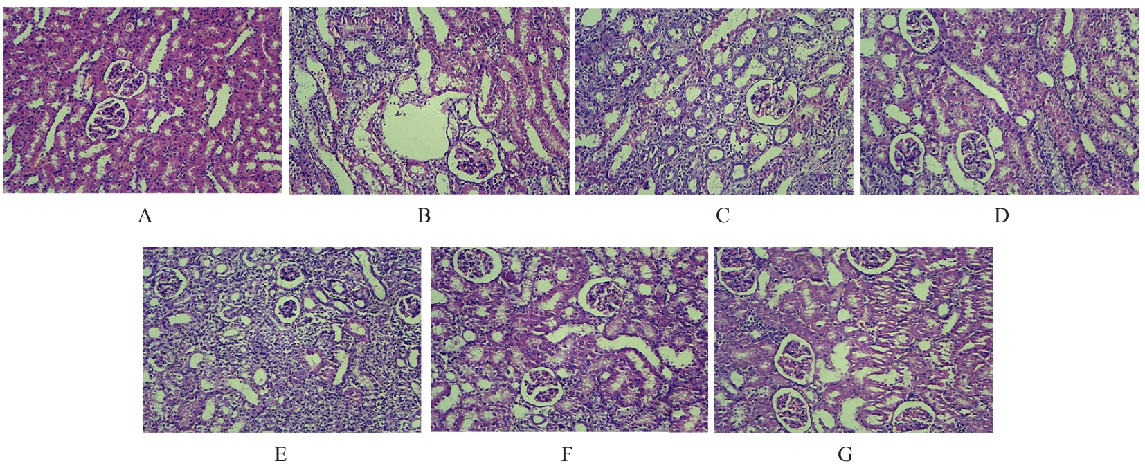 | Group | CRE [cB/(μmol·L-1)] | BUN [cB/(mmol·L-1)] | UA [cB/(μmol·L-1)] | UP [ρB/(g·L-1)] |