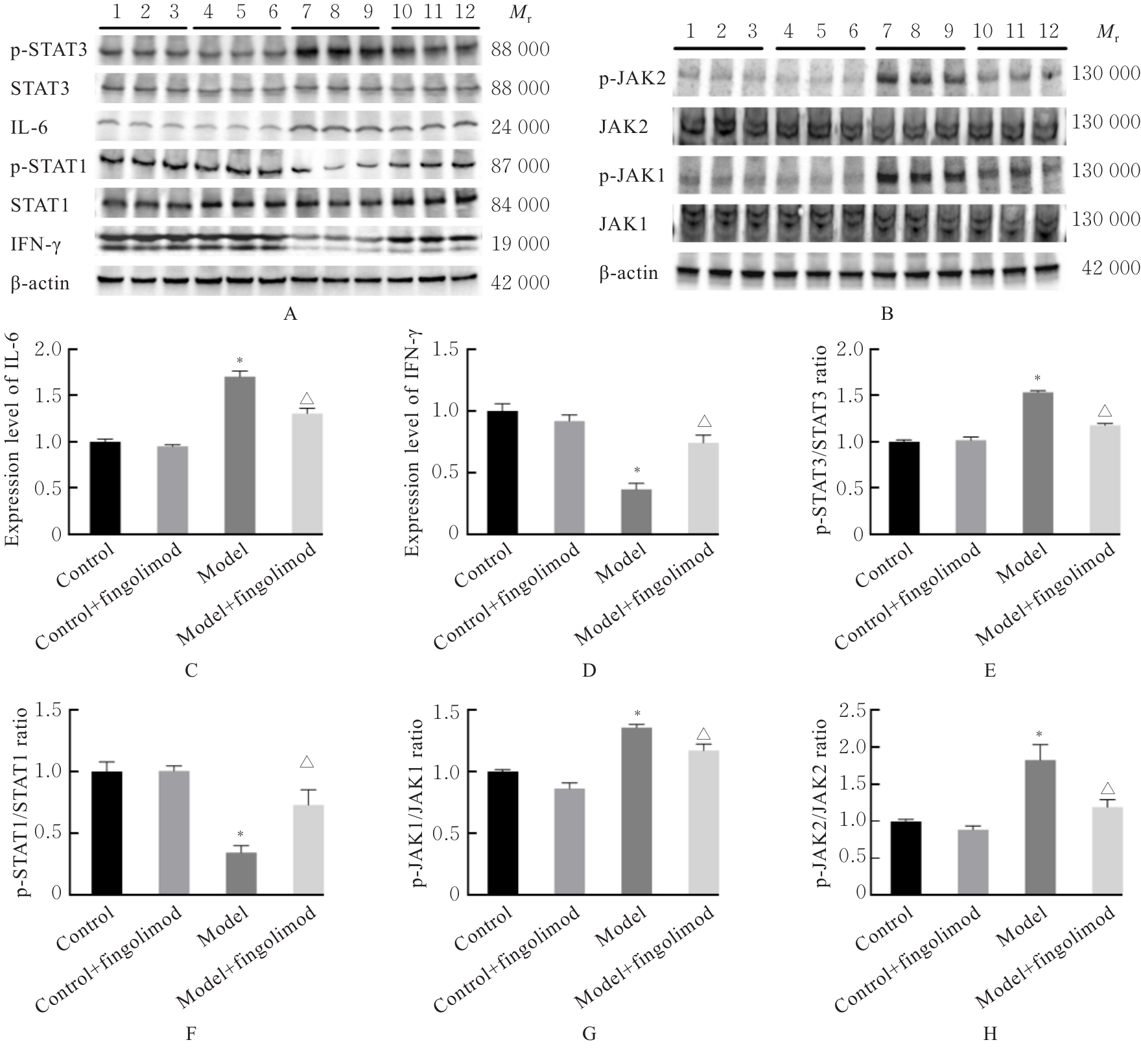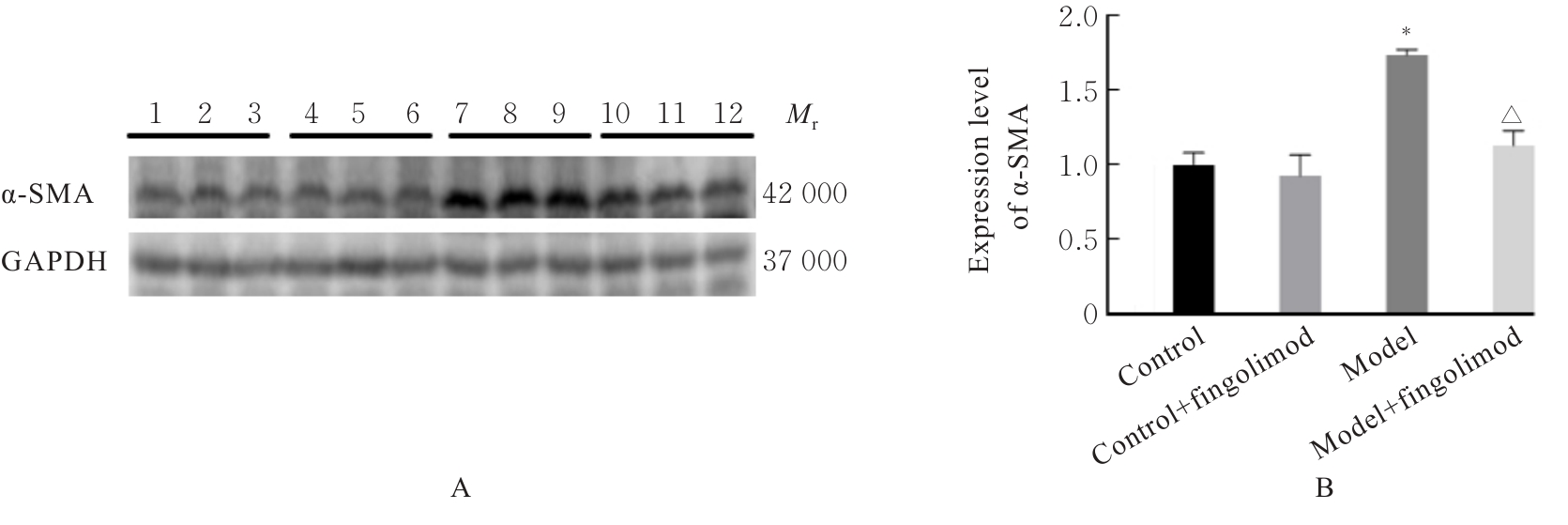 Objective To discuss the improvement effect of fingolimod on liver fibrosis in the mice with type 2 diabetes mellitus (T2DM), and to clarify its mechanism. Methods Sixty male C57BL/6J mice were randomly divided into control group, control+fingolimod group, model group, and model+fingolimod group, with 15 mice in each group. The T2DM model was induced by high-fat diet combined with low dose of streptozotocin (STZ) intraperitoneal injection. After the model was established, the mice in model+fingolimod group and control+fingolimod group were given daily intraperitoneal injection of fingolimod (1.0 mg·kg-1) for 8 weeks. The liver coefficients and fasting blood glucose (FBG) levels of the mice in various groups were detected. The kits were used to detect the activities of alanine aminotransferase (ALT) and aspartate aminotransferase (AST), and the levels of triglyceride (TG), total cholesterol (TC), high-density lipoprotein cholesterol (HDL-C), and low-density lipoprotein cholesterol (LDL-C) in serum of the mice in various groups; HE staining was used to observe the pathomorphology of liver tissue of the mice in various groups; Masson staining was used to observe the morphology of liver fibrosis of the mice in various groups; Oil red O staining was used to detect the lipid deposition in liver tissue of the mice in various groups; real-time fluorescence quantitative PCR(RT-qPCR) method was used to detect the expression levels of α-smooth muscle actin (α-SMA) and Janus kinase (JAK)/signal transducer and activator of transcription (STAT) pathway-related molecules JAK1JAK2STAT1STAT3, interferon-γ (IFN-γ), and interleukin-6 (IL-6) mRNA in liver tissue of the mice in various groups; Western blotting method was used to detect the expression levels of α-SMA, IFN-γ, IL-6,STAT1, phosphorylated STAT1 (p-STAT1), STAT3, phosphorylated STAT3(p-STAT3), JAK1, phosphorylated JAK1(p-JAK1), JAK2 and phosphorylated JAK2(p-JAK2) proteins in liver tissue of the mice in various groups. Results Compared with control group, the liver coefficient and FBG level of the mice in model group were significantly increased (P<0.001); the hepatocytes were swollen, the hepatic sinusoids were narrowed, a large number of lipid droplets and obvious collagen accumulation in liver tissue were observed, and the CVF and lipid droplet area proportion of liver tissue were significantly increased (P<0.001); the activities of ALT and AST and the levels of TC, TG, and LDL-C in serum were significantly increased (P<0.001), while the level of HDL-C was significantly decreased (P<0.001); the expression levels of IL-6 and α-SMA mRNA and protein in liver tissue were significantly increased (P<0.001), the expression levels of IFN-γ mRNA and protein were significantly decreased (P<0.001), the ratios of p-STAT3/STAT3, p-JAK1/JAK1, and p-JAK2/JAK2 were significantly increased (P<0.001), and the ratio of p-STAT1/STAT1 was significantly decreased (P<0.001). Compared with model group, the liver coefficient and FBG level of the mice in model+fingolimod group were significantly decreased (P<0.01); the hepatocyte steatosis, lipid droplets, and fibrosis degree were alleviated, and the CVF and lipid droplet area proportion of liver tissue were significantly decreased (P<0.001); the activities of ALT and AST and the levels of TC, TG, and LDL-C in serum were significantly decreased (P<0.001), while the level of HDL-C was significantly increased (P<0.001); the expression levels of IL-6 and α-SMA mRNA and protein in liver tissue were significantly decreased (P<0.001), the expression levels of IFN-γ mRNA and protein were significantly increased (P<0.001), the ratios of p-STAT3/STAT3, p-JAK1/JAK1, and p-JAK2/JAK2 were significantly decreased (P<0.001), and the ratio of p-STAT1/STAT1 was significantly increased (P<0.001). Conclusion Fingolimod can improve glucose and lipid metabolism disorders, liver function injury, and lipid deposition in liver tissue of T2DM mice, and alleviate liver fibrosis. Its mechanism may be related to up-regulating the expressions of IFN-γ and p-STAT1 and down-regulating the expressions of IL-6 and p-STAT3.