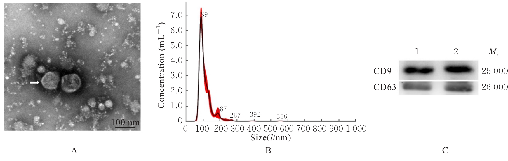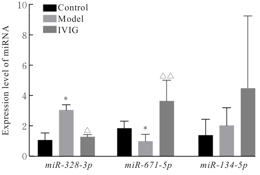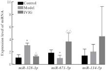 Objective To discuss the correlation between the expression levels of microRNA(miR)-328-3p and miR-671-5p in serum exosomes of the mice with Kawasaki disease and Kawasaki disease as well as their changes after intravenous immunoglobulin (IVIG) treatment, and to provide the potential biomarkers for the early diagnosis and efficacy evaluation of Kawasaki disease. Methods Twelve 4-week-old SPF grade male C57BL/6J mice were randomly divided into control group, model group, and IVIG group, with 4 mice in each group. The mice in model group and IVIG group were intraperitoneally injected with Lactobacillus casei cell wall extract (LCWE) to establish the Kawasaki disease models, while the mice in control group were intraperitoneally injected with equal volume of normal saline; the mice in IVIG group were intraperitoneally injected with IVIG for intervention on the 5th day. Four weeks later, the heart tissue of the mice in various groups was collected, and HE staining was used to observe the pathomorphology of the heart tissue of the mice in various groups; the blood of the mice in various groups was collected and the exosomes were isolated. Particle size detection, transmission electron microscopy, and Western blotting method were used to identify the exosomes. Real-time fluorescence quantitative PCR (RT-qPCR) method was used to detect the expression levels of miR-328-3pmiR-134-5p, and miR-671-5p in the serum exosomes of the mice in various groups. Results The HE staining results showed that in control group, the myocardial structure of the mice was regular, and there was no inflammatory cell infiltration in the coronary arteries; in model group, diffuse inflammatory cell infiltration was observed in the local coronary arteries of the mice; compared with model group, the inflammatory cell infiltration in the myocardium tissue of the mice in IVIG group was significantly reduced. The exosome identification results showed that spherical or oval vesicles with a diameter of 30-150 nm were observed under transmission electron microscope, the main peak of particle size was within 150 nm, and the exosome markers CD9 and CD63 were positively expressed. The RT-qPCR results showed that compared with control group, the expression level of miR-328-3p in the serum exosomes of the mice in model group was significantly increased (P<0.05), and the expression level of miR-671-5p was significantly decreased (P<0.05); compared with model group, the expression level of miR-328-3p in the serum exosomes of the mice in IVIG group was significantly decreased (P<0.05), and the expression level of miR-671-5p was significantly increased (P<0.01); there was no statistically significant difference in the expression level of miR-134-5p in the serum exosomes of the mice among the three groups (P>0.05). Conclusion The up-regulation of miR-328-3p expression and the down-regulation of miR-671-5p expression are both associated with Kawasaki disease, and this abnormal expression can be reversed after IVIG treatment, suggesting that both of them may serve as the potential molecular biomarkers for the diagnosis and efficacy evaluation of Kawasaki disease.