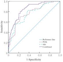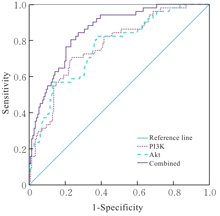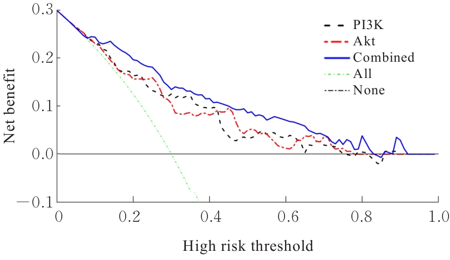 Objective To discuss the changes of the levels of phosphatidylinositol 3-kinase (PI3K) and protein kinase B (Akt) in serum of the patients with Sj?gren’s syndrome (SS), and to clarify their relationships with thrombocytopenia (TP) in the SS patients. Methods A total of 198 SS patients admitted to our hospital from January 2022 to December 2024 were selected. According to the platelet (PLT) count levels, they were divided into SS-TP group (n=51) and SS-non-TP (NTP) group (n=147). The clinical data of the patients in two groups were collected; Pearson correlation analysis was used to analyze the correlations between the serum levels of PI3K and Akt and PLT count in the SS patients; χ2 test and independent sample t test were used to analyze the relationships between the clinical data of the SS patients and TP; multivariate Logistic regression analysis was used to screen the independent predictors for the risk of TP in the SS patients; receiver operating characteristic (ROC) curve was drawn to evaluate the predictive efficacy of the predictors; decision curve was used to assess the clinical utility of the predictors. Results Among the 198 SS patients, 51 patients (25.76%) complicated with TP were included as SS-TP group, and the remaining patients were included as SS-NTP group. Compared with SS-NTP group, the serum levels of PI3K and Akt of the patients in SS-TP group were significantly decreased (P<0.05). The serum levels of PI3K (r=0.416, P<0.001) and Akt (r=0.425, P<0.001) of the SS patients were positively correlated with PLT count. Compared with SS-NTP group, the percentage of lymphadenectasis of the patients in SS-TP group was significantly increased (P<0.05), and the lymphocyte count and hemoglobin level were significantly decreased (P<0.05). The Logistic regression analysis results showed that the concurrent TP in the SS patients was associated with the decrease in the lymphocyte count, hemoglobin level, and serum levels of PI3K and Akt (P<0.05 or P<0.01). The area under curve (AUC) value of serum PI3K level for predicting concurrent TP in the SS patients was 0.770, the AUC value of serum Akt level for predicting concurrent TP in the SS patients was 0.763, and the AUC value of the combined prediction of the two was 0.853. The efficacy of the combined prediction of serum PI3K level and serum Akt level for concurrent TP in the SS patients was better than that of either alone (combined prediction-serum PI3K level: Z=2.779, P=0.006; combined prediction-serum Akt level: Z=2.907, P=0.004). Within the threshold range of 0.10-0.82, the net benefit rate of the combined prediction of serum PI3K and Akt levels for the risk of concurrent TP in the SS patients was higher than that of the separate assessment of serum PI3K or Akt levels. Conclusion The decrease of serum PI3K and Akt levels are associated with the risk of concurrent TP in SS patients, and the combined assessment of the two has a high predictive value for the occurrence of TP.